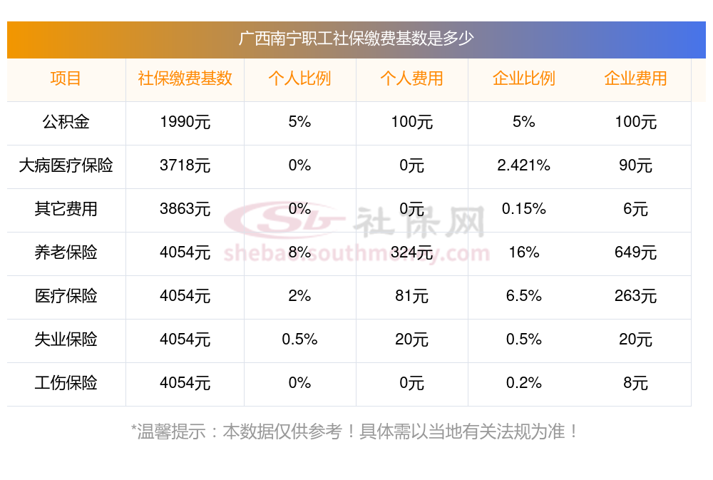 据新社通app显示,广西南宁社保缴费基数2025标准,(社保最低一个月要交多少钱)广西南宁社保费用如下:
