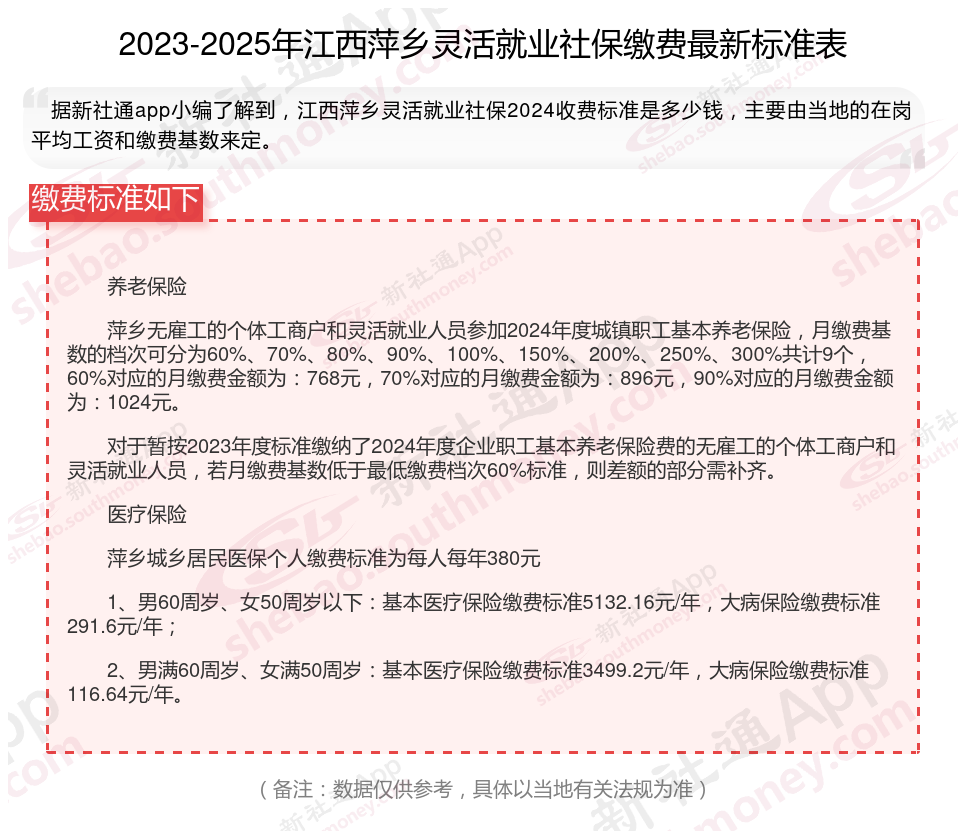 据新社通app数据显示,江西萍乡灵活就业养老保险缴费基数2024-2025年最新标准如下: