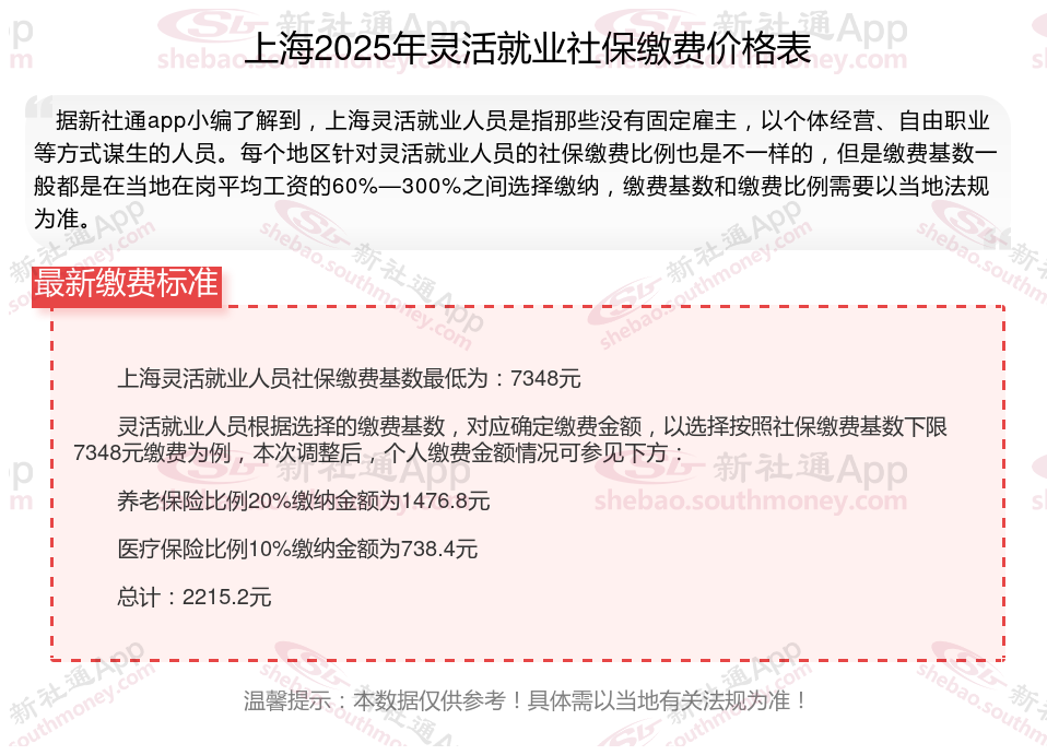 那么,上海灵活就业人员社保多少钱一个月?根据新社通app-社保缴费查询工具提供的2025社保缴费标准详情数据: