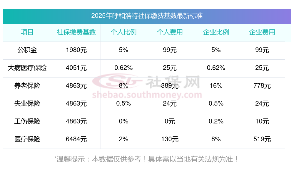 社保卡一年交多少钱?下表是2025年呼和浩特社保费用明细参考,新社通app-社保缴费查询工具提供的最新数据如下:
