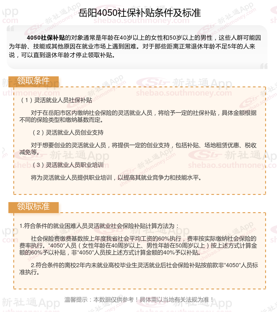 二、2025年岳阳4050社保补贴标准及条件,最新如下: