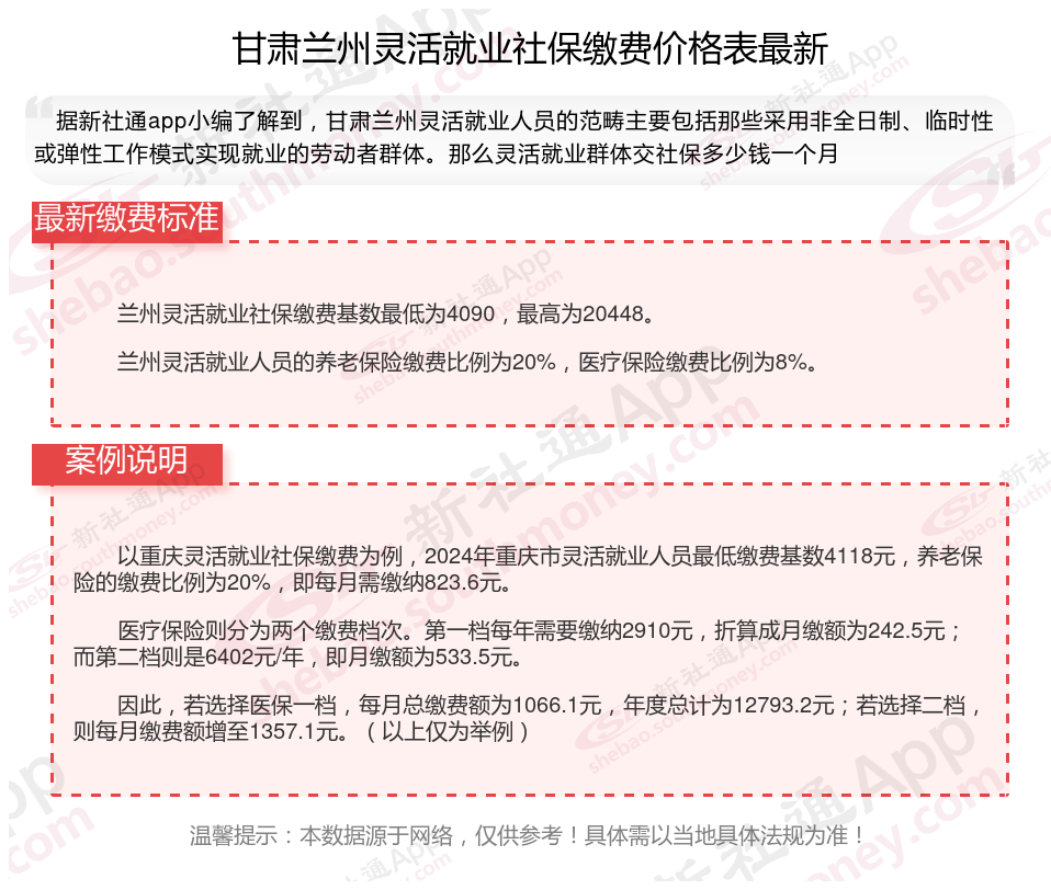 据新社通app显示,2024-2025年甘肃兰州灵活就业人员养老保险的缴费标准是根据缴费基数来确定的: