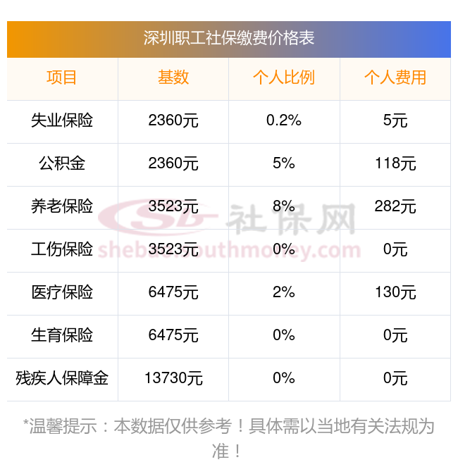 据新社通小编了解到,深圳职工社保缴费基数为:3523.00,个人费用约为:281.84元,企业费用约为:528.45元。