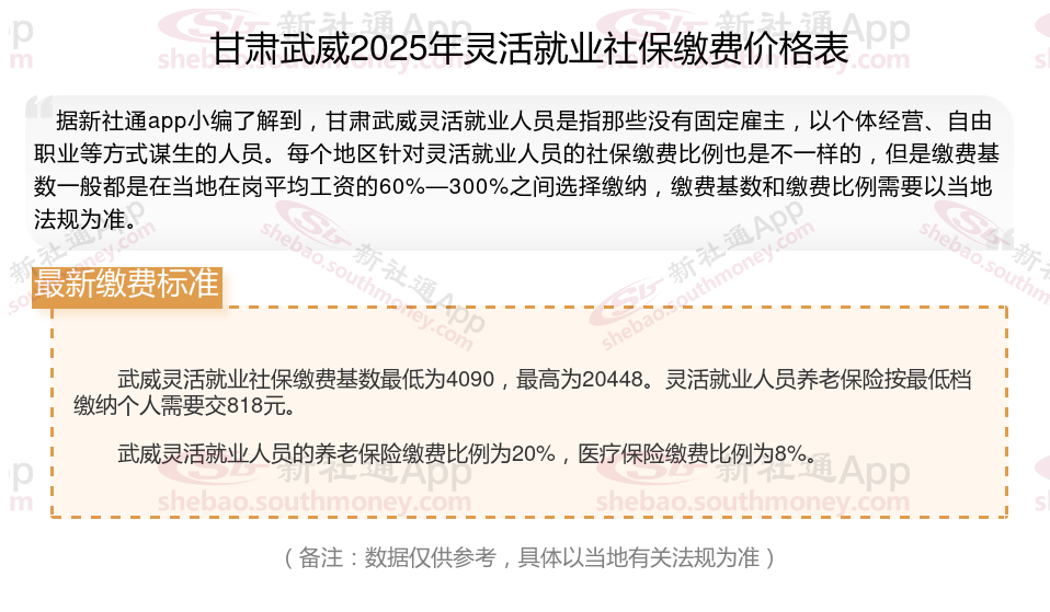一、2025年甘肃武威灵活就业社保缴费标准表是多少?具体如下: