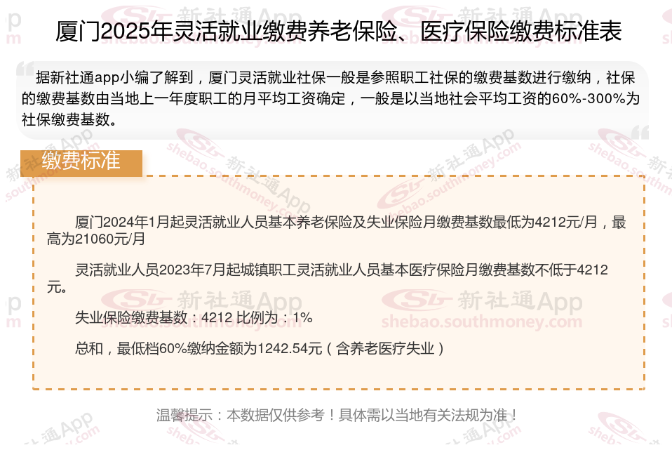 一、2025年厦门灵活就业社保缴费基数、比例最新消息