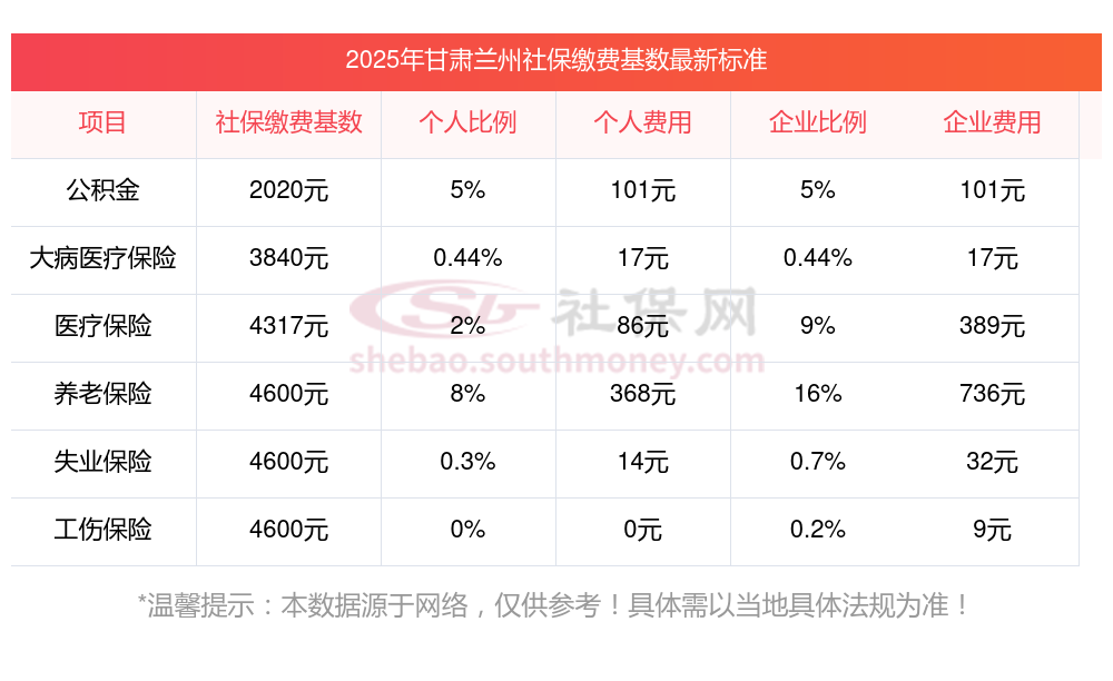 确定社保基数要依据职工上一年度1月至12月的所有工资性收入所得的月平均额,此基数用于计算缴纳社会保险费的工资基数。那么,2025年甘肃兰州社保缴费基数是多少,甘肃兰州社会险每月交多少钱,下面随新社通app小编一起来了解具体内容。