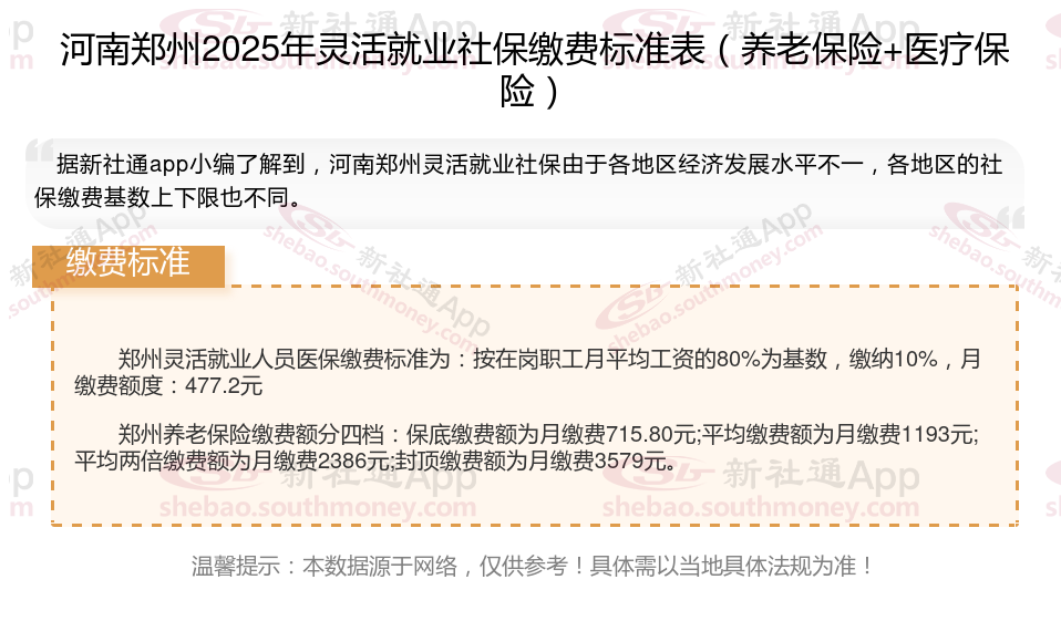 据新社通app显示,2024-2025年河南郑州灵活就业养老保险的缴费标准: