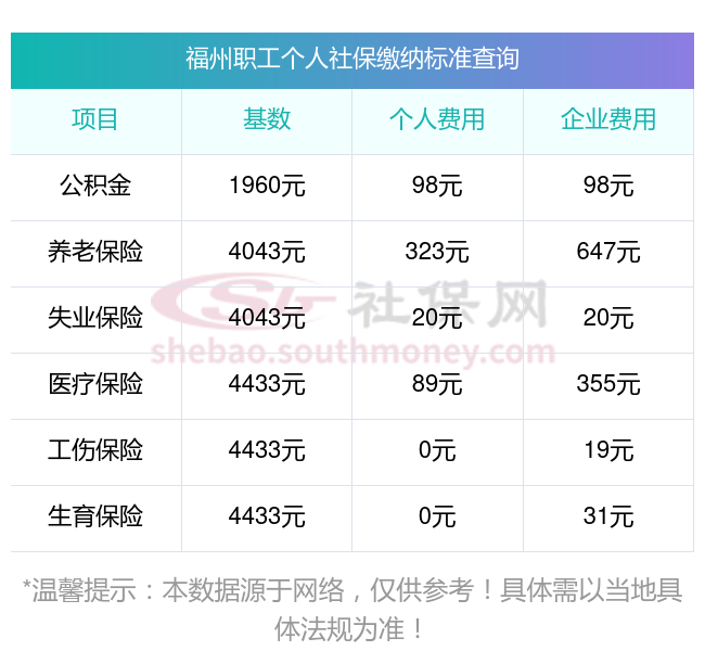 2025年福州社保多少钱一个月?福州社保缴费基数、比例一览表福州在职人员缴纳的社保费用,一般都是交纳五险,按照最低缴费档次进行交费,一年大概需要交几千元至一万多元,如果按照最高缴费档次进行交费,一年大概要交几万元。