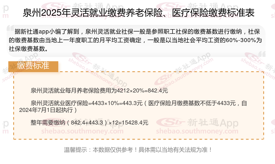 据新社通app数据显示,泉州灵活就业人员养老保险缴费基数2024-2025年最新标准如下: