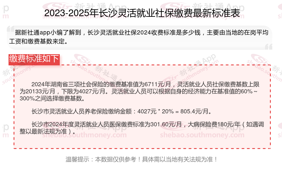 据新社通app显示,长沙灵活就业养老缴费基数明细如下: