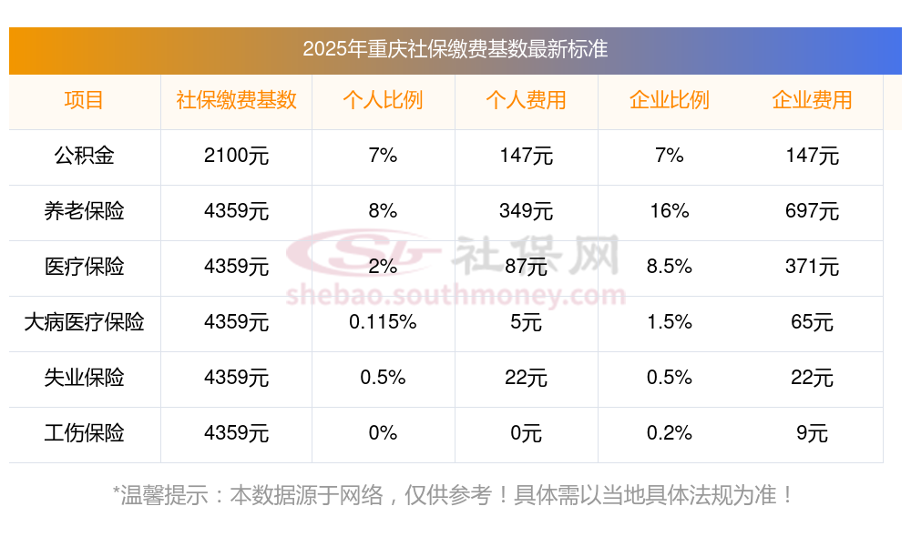 据新社通小编了解到,社保缴费基数的确定主要依据职工上一年度的月平均工资,并结合当地社会平均工资的上下限(60%-300%)进行调整。 目前,重庆社保缴费基数为:4359.00,个人费用约为:348.72元,企业费用约为:697.44元。