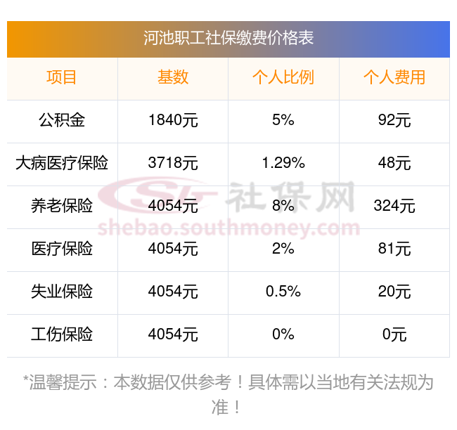 据新社通app显示,河池社保缴费基数2025年标准,(社保最低一个月要交多少钱)河池社保费用如下:
