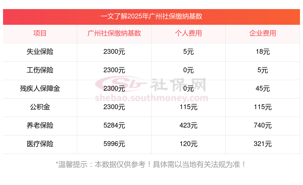 一、据新社通小编了解到,社保缴费基数的确定主要依据职工上一年度的月平均工资,并结合当地社会平均工资的上下限(60%-300%)进行调整。 目前,广州社保缴费基数为:5284.00,个人费用约为:422.72元,企业费用约为:739.76元。