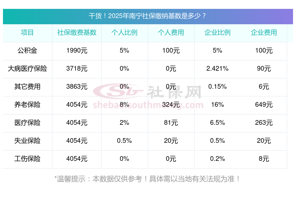 一、据新社通小编了解到,社保缴费基数的确定主要依据职工上一年度的月平均工资,并结合当地社会平均工资的上下限(60%-300%)进行调整。 目前,南宁社保缴费基数为:4053.60,个人费用约为:324.288元,企业费用约为:648.576元。