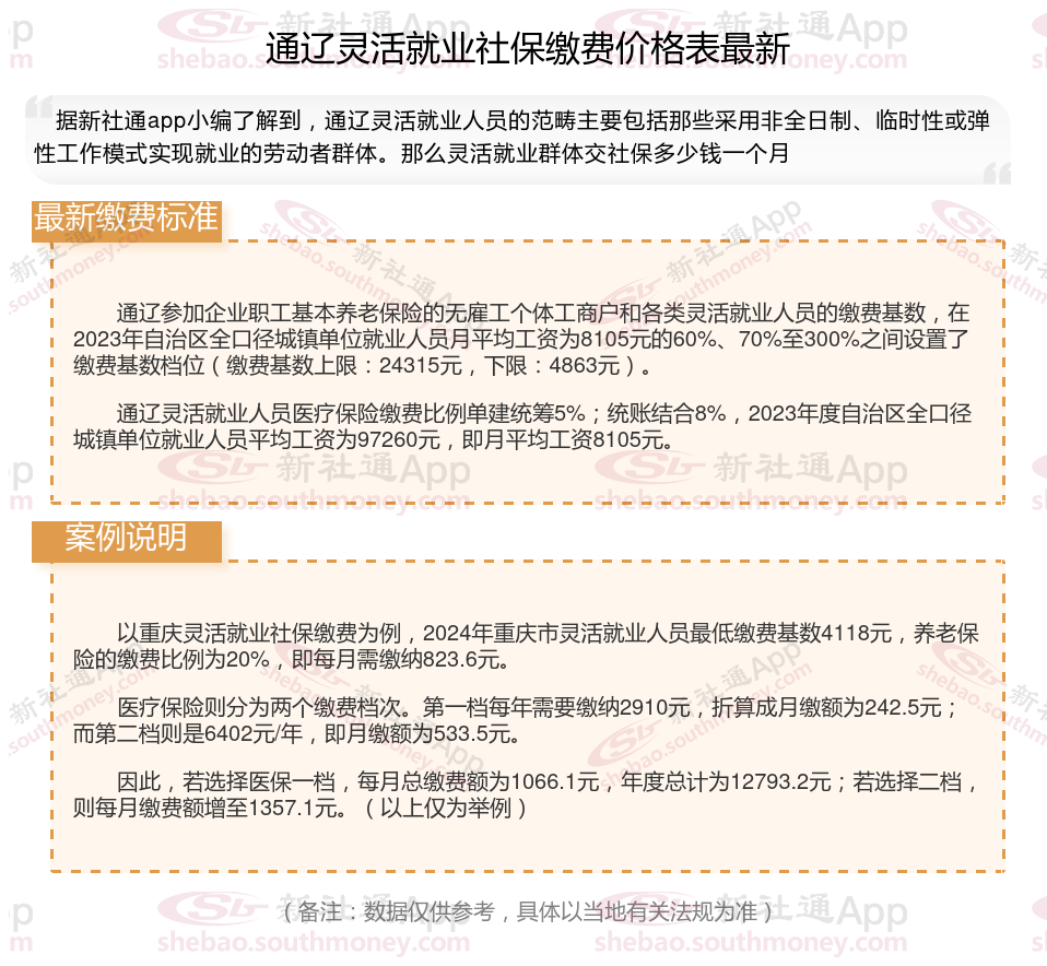 据新社通app数据显示,通辽灵活就业人员养老缴费基数2024-2025年最新标准如下:
