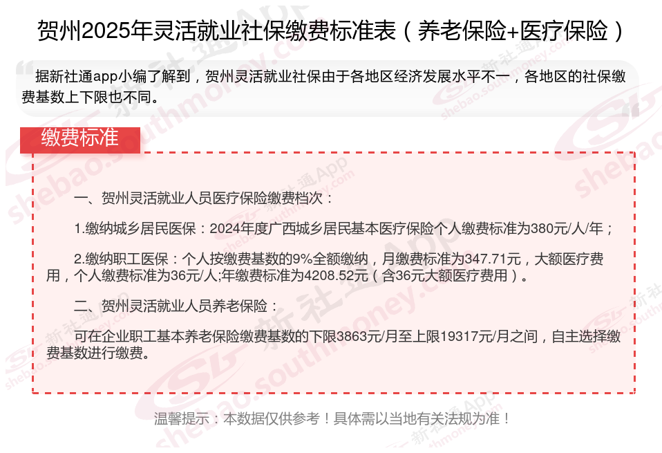 灵活就业社保通常只需缴纳养老和医疗两项(部分地区可自愿选缴失业险),其他险种无需强制缴纳。灵活就业社保缴费满15年后,退休后可领取养老金,避免老年无收入来源。接下来随社保君了解一下2025年贺州灵活就业人员社保交多少钱,2025年贺州灵活就业社保缴费标准的详细内容。