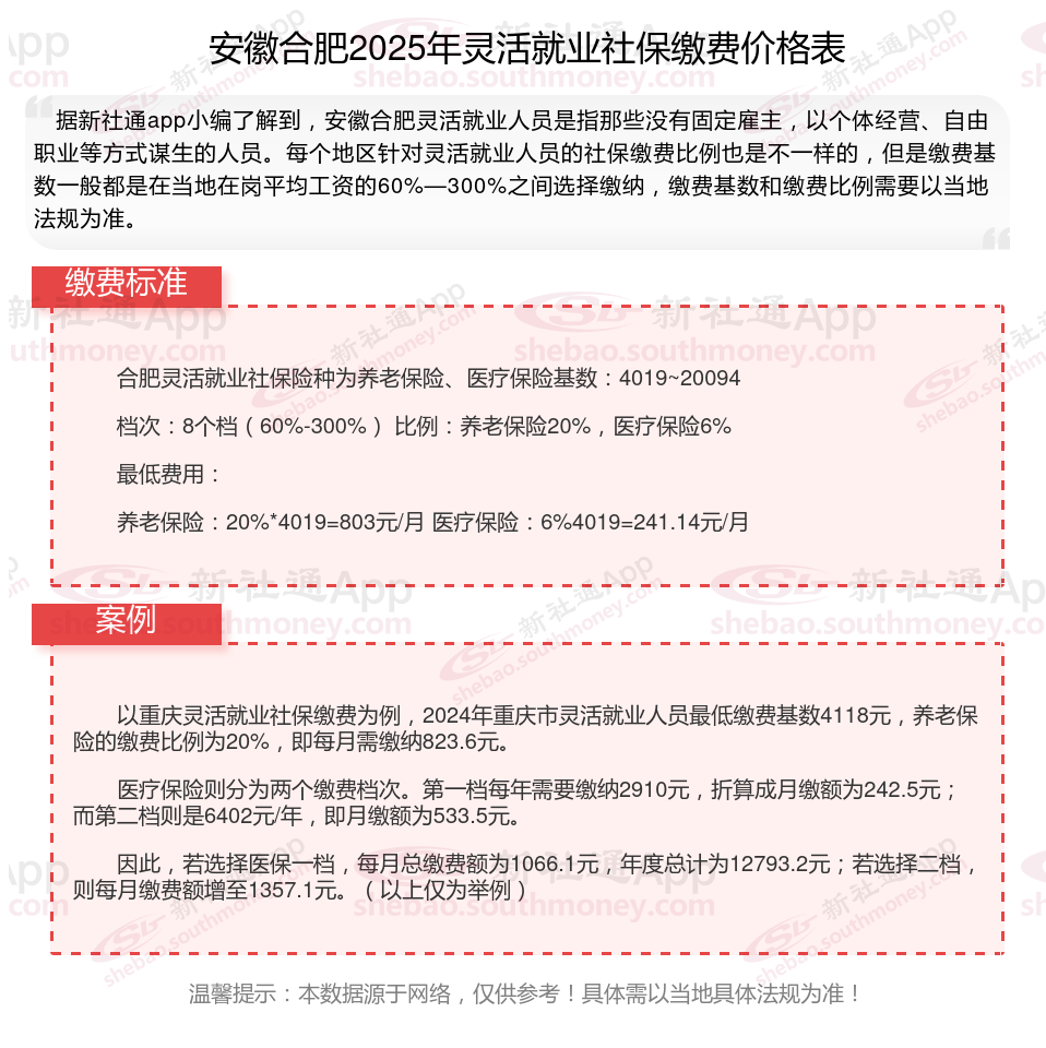 安徽合肥2025年灵活就业人员社保缴费标准公布