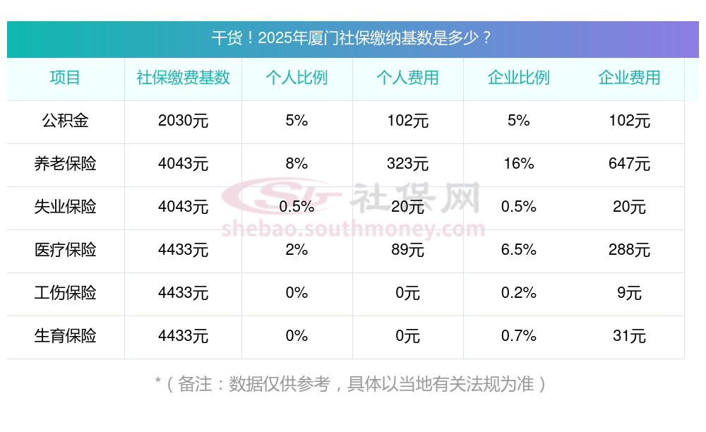 一、据新社通app-查阅了解到,社保基数由职工上一年度1月至12月所有工资性收入所得的月平均额确定,确定后的基数被用于计算缴纳社会保险费的工资基数。 目前该厦门社保的缴费基数为:4043.00,个人费用约为:323.44元,企业费用约为:646.88元。