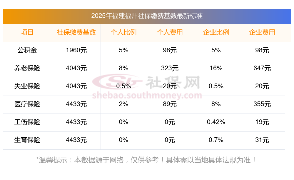 多个因素共同作用,确定了社保的缴费金额,包括缴费基数、缴费比例,以及当地的具体法规要求。接下来看看,2024-2025年福建福州社保缴费多少钱呢?2025年福建福州社会养老、医保缴纳基数及比例一览表?,如下: