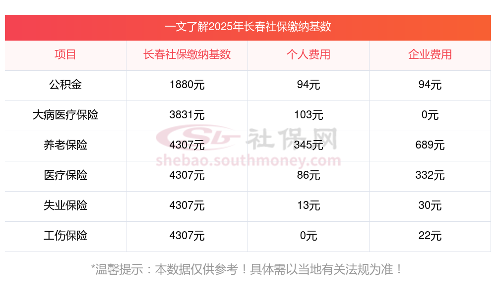 (1)据新社通app-查阅了解到,职工上一年1月至12月全部工资性收入所得的月平均额,确定了社保基数,而社保基数是计算缴纳社会保险费工资基数的依据。 目前该长春社保的缴费基数为:4307.10,个人费用约为:344.568元,企业费用约为:689.136元。