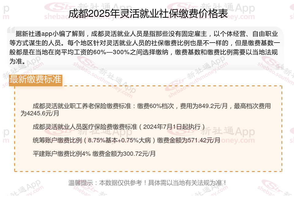随着经济社会的不断发展,灵活就业群体日益壮大,其社保缴费问题也愈发受到关注。那么2025年成都灵活就业人员社保需要交多少钱,缴费比例是多少?下面随新社通小编一起来看看。
