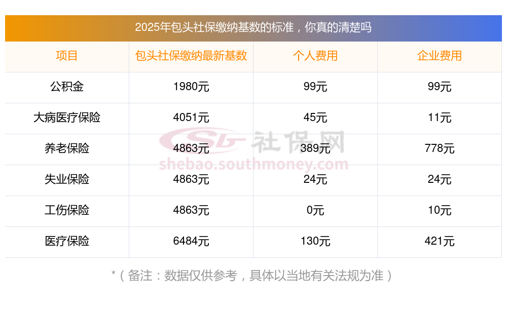 (1)据新社通小编了解到,以职工上一年度月平均工资作为社保缴费基数确定的主要参考,结合当地社会平均工资上下限(60%-300%)进行调整。 目前,包头社保缴费基数为:4863.00,个人费用约为:389.04元,企业费用约为:778.08元。
