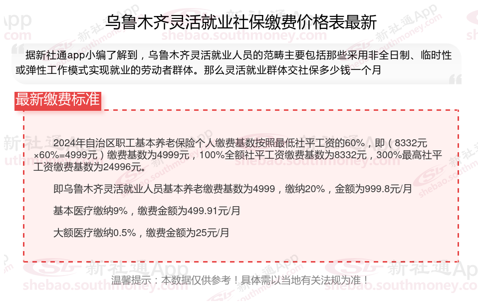 乌鲁木齐灵活就业人员基本养老保险缴费基数暂按不低于4999元;