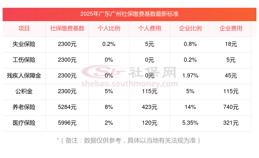 一、据新社通小编了解到,社保缴费基数的确定主要依据职工上一年度的月平均工资,并结合当地社会平均工资的上下限(60%-300%)进行调整。 目前,广东广州社保缴费基数为:5284.00,个人费用约为:422.72元,企业费用约为:739.76元。