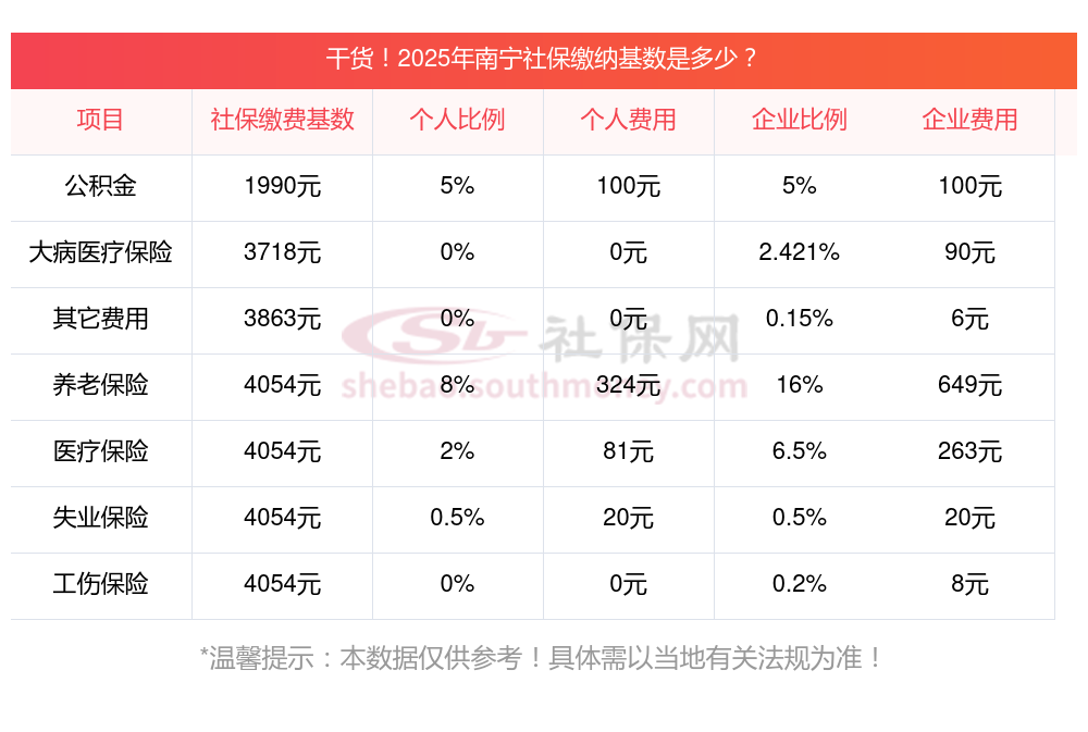 2025年南宁职工社保缴费基数是多少钱一个月?职工社保缴纳标准是多少?