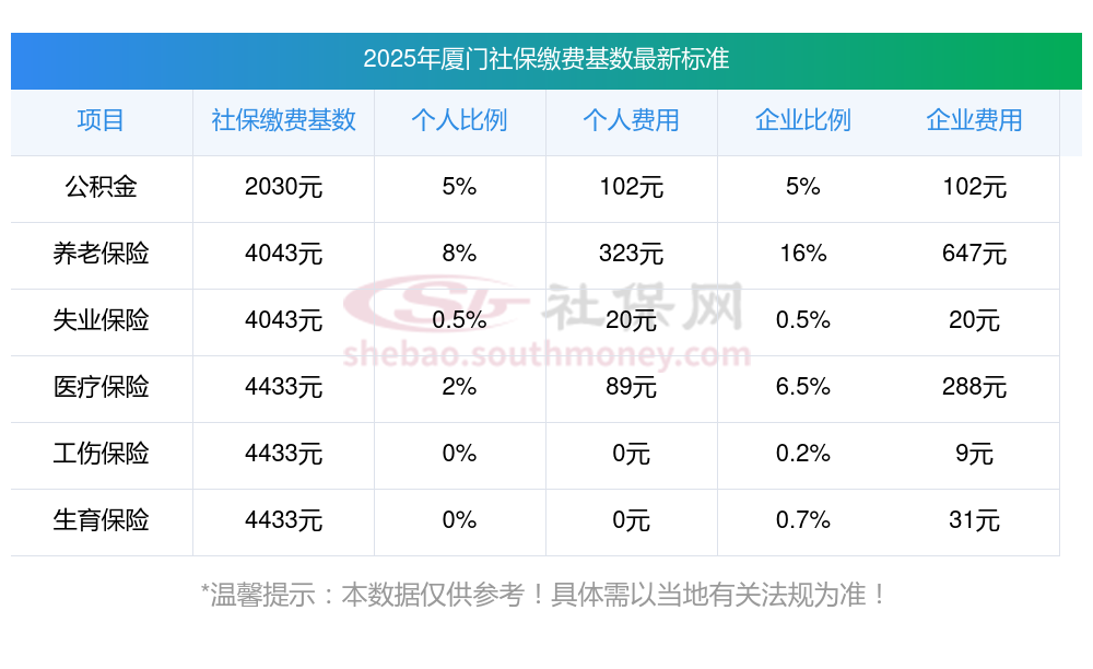 缴纳社保能抵御疾病、失业、养老等重大风险,避免陷入经济困境。也能享受医保报销、养老金增长等红利。社保是劳动者的法定权利,断缴可能影响购房、落户、子女教育等。接下来随社保君了解一下2025年厦门社保交多少钱,2025年厦门社保缴费标准的详细内容。