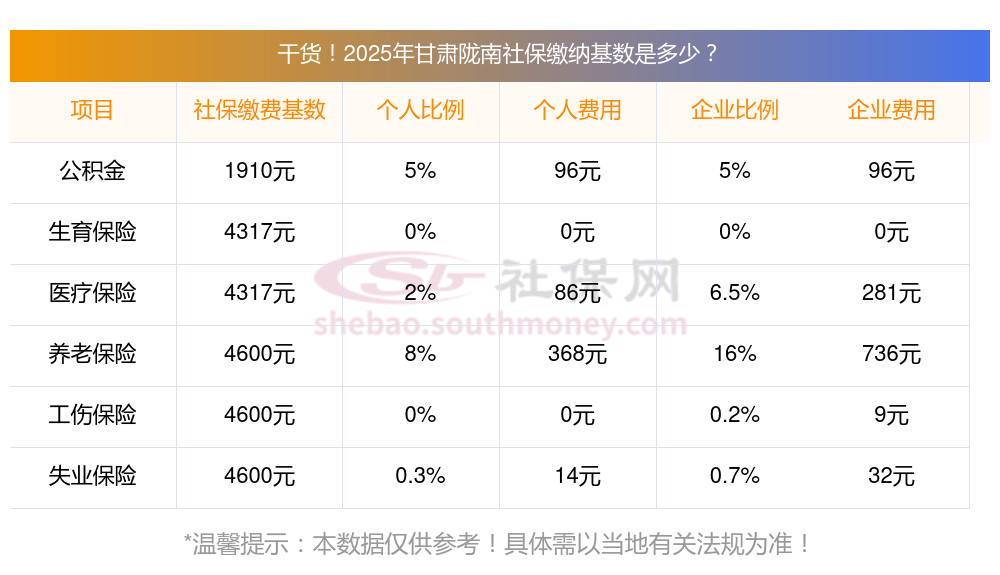 职工上一年1月至12月期间所有工资性收入所得的月平均额,用来确定社保基数,该基数用于计算社会保险费缴纳的工资基数。那么,2025年甘肃陇南社保个人缴费标准(缴费基数+缴费比例),下面随新社通app小编一起来了解具体内容。