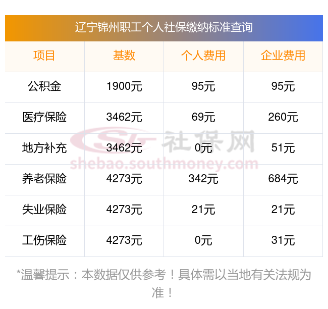 2025年辽宁锦州社保缴费多少钱?下表是2024-2025年辽宁锦州社保费用明细参考,新社通app-社保缴费查询工具提供的最新数据如下: