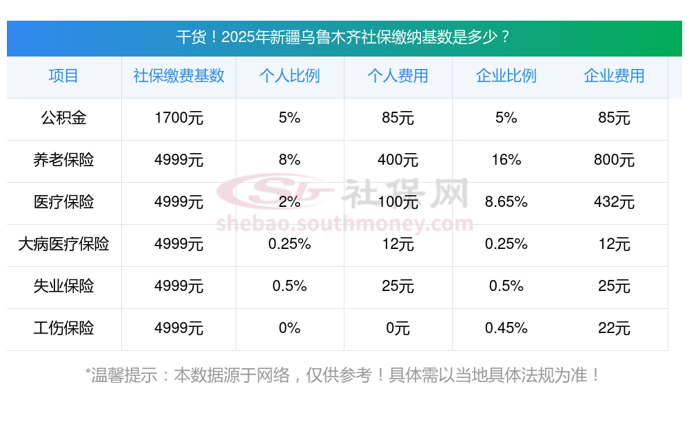 (1)据新社通app-查阅了解到,社保基数的确定,依据职工上一年1月到12月期间,所有工资性收入所得的月平均金额,此金额用于计算社会保险费缴纳的工资基数。 目前该新疆乌鲁木齐社保的缴费基数为:4999.00,个人费用约为:399.92元,企业费用约为:799.84元。