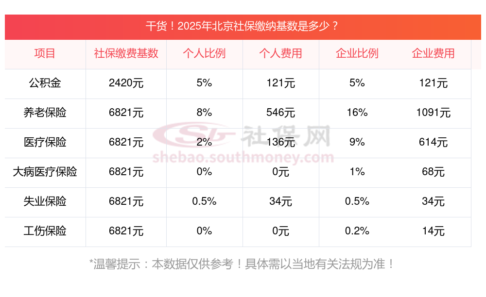 一、据新社通小编了解到,社保缴费基数主要依据职工上一年度月均工资来确定,同时要结合当地社会平均工资在60%至300%之间的上下限标准进行调整。 目前,北京社保缴费基数为:6821.00,个人费用约为:545.68元,企业费用约为:1091.36元。