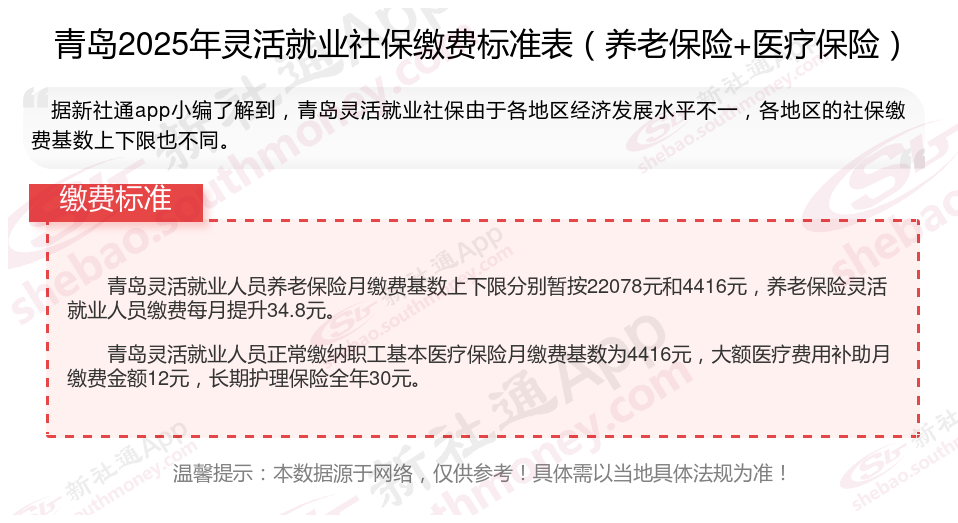 据新社通app显示,青岛灵活就业养老保险缴费基数2024-2025年最新标准如下: