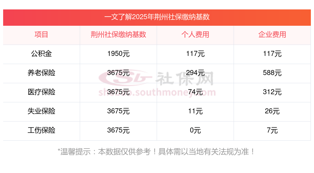 2025年荆州社保个人缴费基数及标准比例是多少,据新社通app-查阅了解到,确定社保基数要依据职工上一年度1月至12月的所有工资性收入所得的月平均额,此基数用于计算缴纳社会保险费的工资基数。 目前该荆州社保的缴费基数为:3675.00,个人费用约为:294元,企业费用约为:588元。