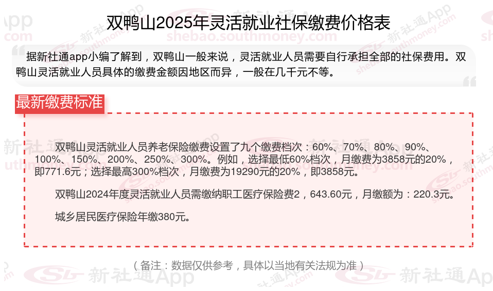 那么,双鸭山灵活就业人员社保缴费基数最新标准,双鸭山灵活就业社保多少钱一个月?根据新社通app-社保缴费查询工具提供的2025社保缴费标准详情数据:
