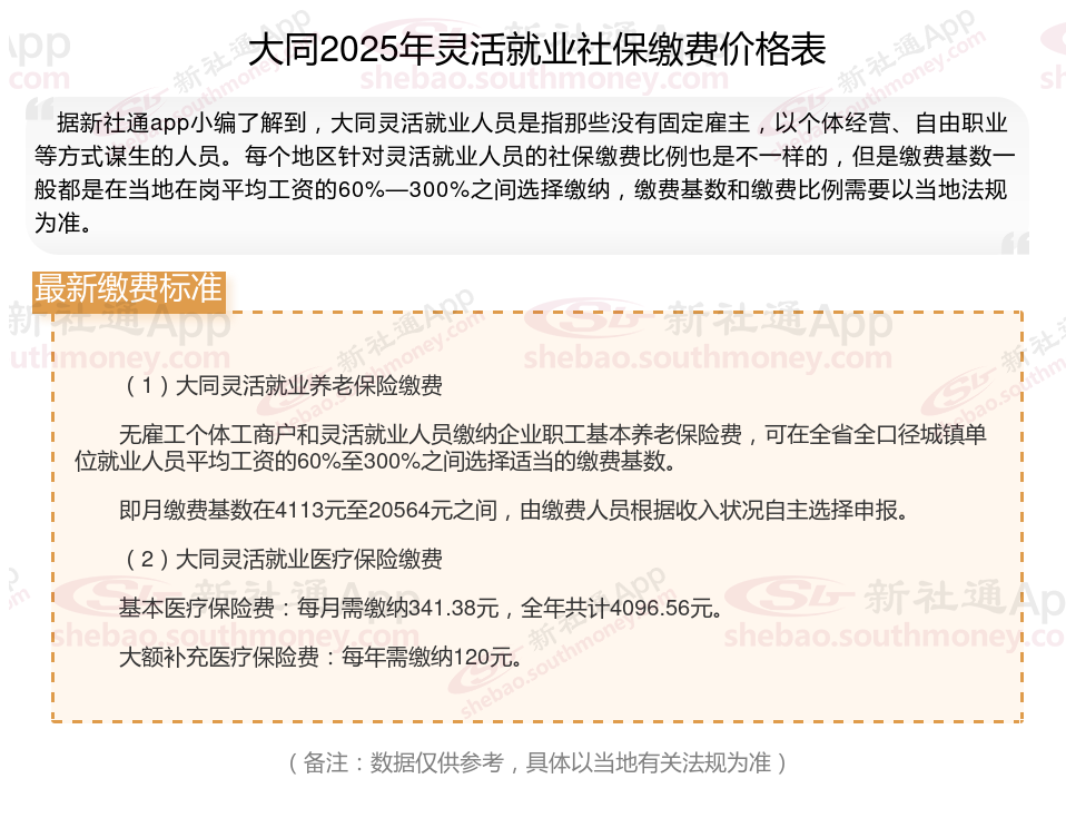 大同2025年灵活就业人员社保缴费标准公布