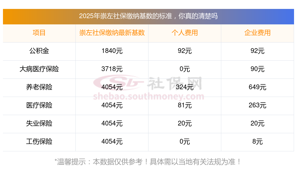 (1)据新社通小编了解到,社保缴费基数的确立,主要借助职工上一年度月平均工资,再结合当地社会平均工资60%-300%的上下限进行调整。 目前,崇左社保缴费基数为:4053.60,个人费用约为:324.288元,企业费用约为:648.576元。
