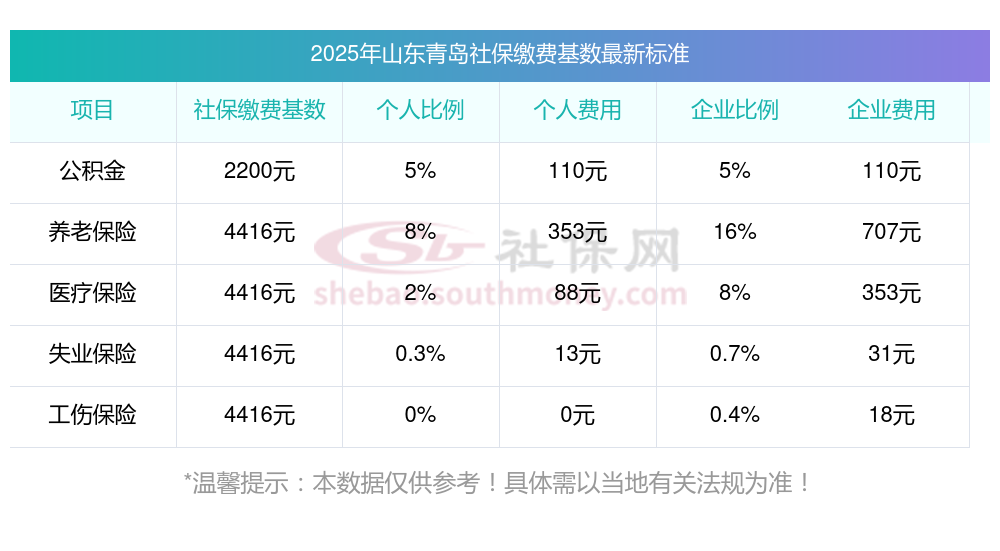 一、据新社通小编了解到,社保缴费基数主要根据职工上一年度月平均工资来确定,随后结合当地社会平均工资上下限(60%-300%)进行调整。 目前,山东青岛社保缴费基数为:4416.00,个人费用约为:353.28元,企业费用约为:706.56元。