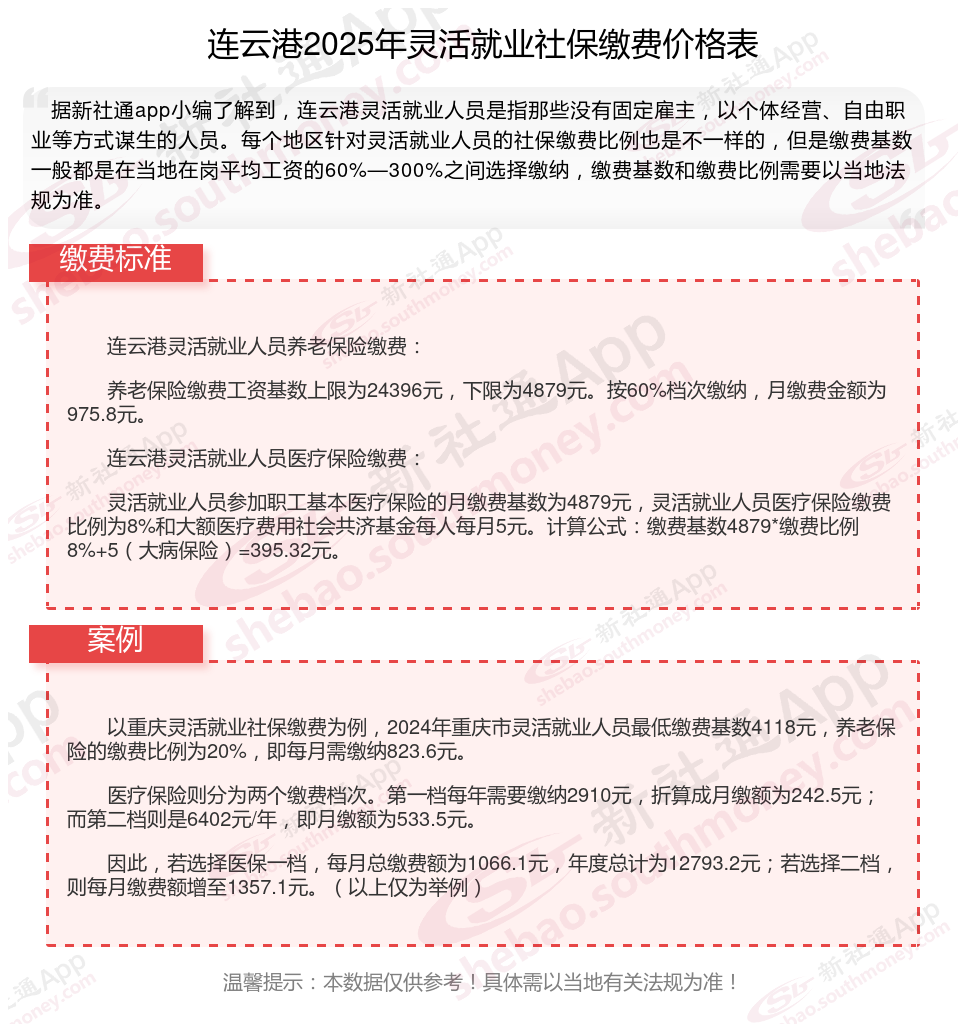 连云港灵活就业社保缴费标准来了 灵活就业人员保险一个月交多少钱?根据新社通app-社保缴费查询工具提供的最新数据如下: