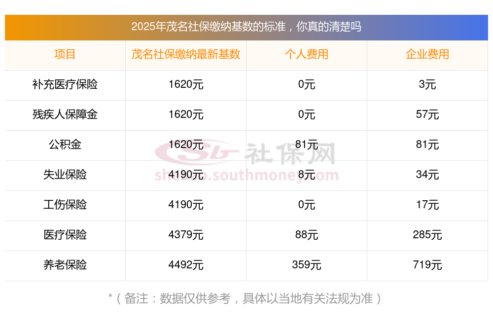 (1)据新社通小编了解到,社保缴费基数的确立,主要借助职工上一年度月平均工资,再结合当地社会平均工资60%-300%的上下限进行调整。 目前,茂名社保缴费基数为:4492.00,个人费用约为:359.36元,企业费用约为:718.72元。