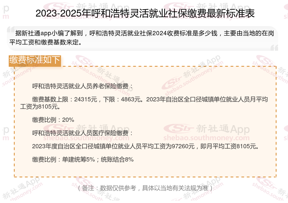 据新社通app显示,呼和浩特灵活就业人员养老保险缴费基数2024-2025年最新标准如下: