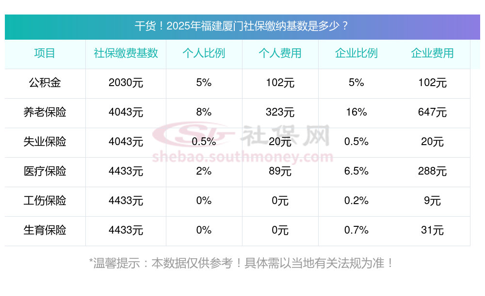 (1)据新社通小编了解到,职工上一年度月平均工资是社保缴费基数确定的重要基础,之后结合当地社会平均工资60%-300%的上下限进行调整。 目前,福建厦门社保缴费基数为:4043.00,个人费用约为:323.44元,企业费用约为:646.88元。