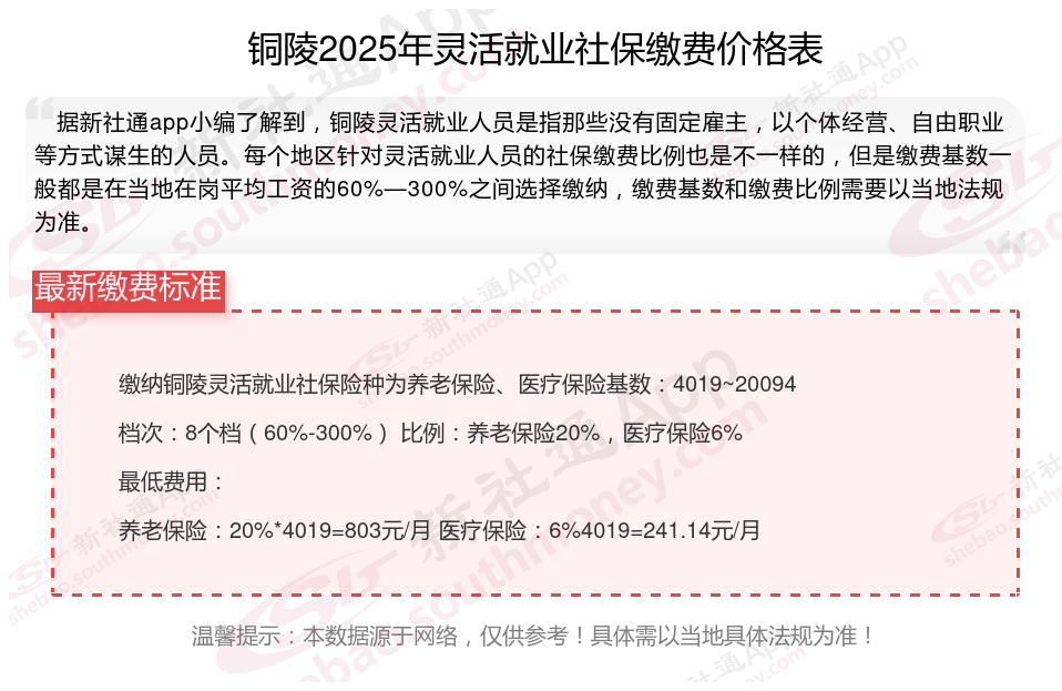 据新社通app显示,铜陵灵活就业养老保险最低缴费基数为:4019元;个人的缴费比例分别为:20%;