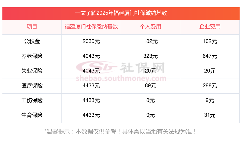 多个因素左右着社保的缴费金额,其中缴费基数、缴费比例,以及当地的具体法规是主要确定因素。接下来看看,2025年福建厦门社保缴费标准及比例是多少??如下:
