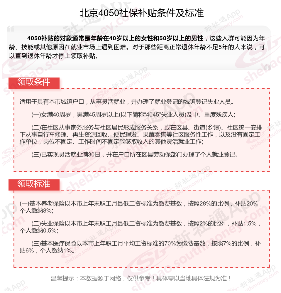 北京40、50、60 年出生人群补贴需要符合什么条件,4050补贴需要哪些资料?想要享受4050补贴,年龄条件设定为女性年满40周岁,男性年满50周岁。