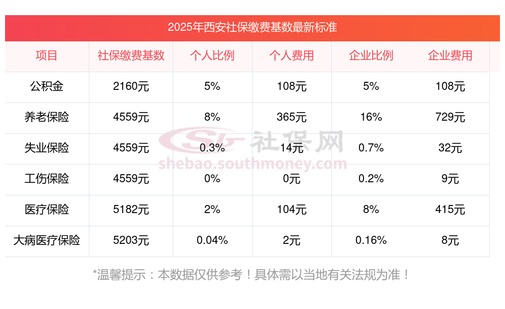 社保缴费数额的高低由缴费基数、缴费比例,以及当地在社保领域的具体法规等因素共同影响。接下来看看,2025年西安社保缴费标准及比例是多少??如下: