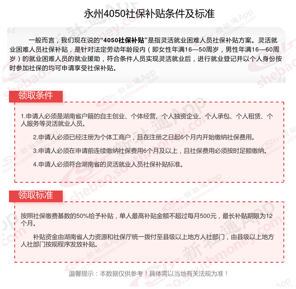 二、2025年永州4050社保补贴标准及条件,最新如下: