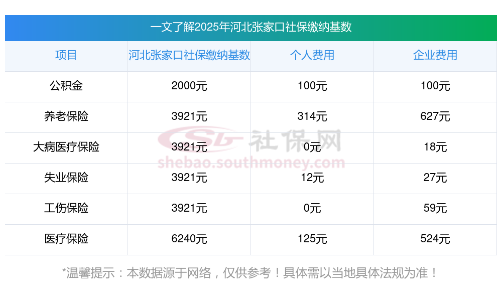 一、据新社通app-查阅了解到,确定社保基数要依据职工上一年度1月至12月的所有工资性收入所得的月平均额,此基数用于计算缴纳社会保险费的工资基数。 目前该河北张家口社保的缴费基数为:3920.55,个人费用约为:313.644元,企业费用约为:627.288元。